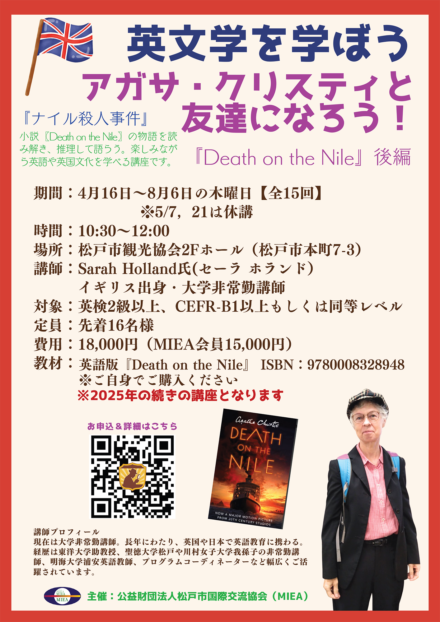 õÄå¾®Àâ〖Death on the Nile〗¤Îʪ¸ì¤òÆÉ¤ß²ò¤¡¢Èȿͤò¿äÍý¤·¤Æ¸ì¤é¤¦¡£³Ú¤·¤ß¤Ê¤¬¤é±Ñ¸ì¤ä±Ñ¹ñʸ²½¤ò³Ø¤Ó¤Þ¤¹¡£